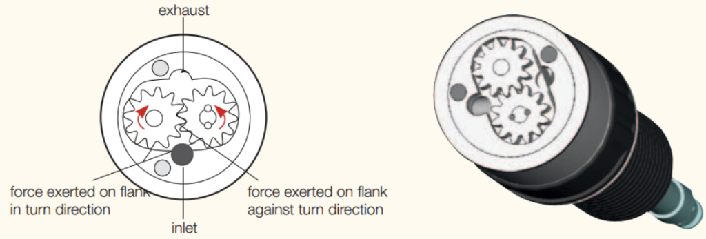 Tooth geared motor: Gear motors consist of two gear wheels, that run in a housing with minimal play. One gear-wheel is rigidly interconnected with the drift shaft, the other generates the torque. Two gear-flats are directed with compressed air into the turn-direction and one gear-flat against the turn-direction. The exhaust air is directed into chambers – that are formed between the gear-flat and housing wall – towards the exhaust air side and rotation is generated.