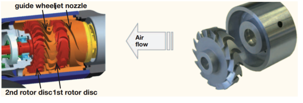 Turbine Air Motor: It uses a turbine wheel inside the motor. A rotor is attached to the turbine wheel, which consists of curved blades through which air passes. As the air passes, it turns the rotor, which rotates the motor. The conversion of the pressure energy into kinetic energy takes place in the inlet nozzle. On a two-stage turbine, the largest part of the kinetic energy is converted in the 1st turbine wheel. The air-flow is diverted over the stationary turbine wheel. The remaining energy is converted in the 2nd turbine wheel These air motors are used in applications that require high speed with low torque.