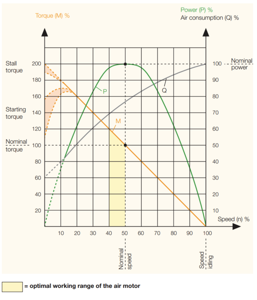 Air motors function in a very broad working range which can be decisively influenced by the amount of supplied air and the air pressure. Next determine the working position for your motor: Which nominal torque and which speed (when loaded) do you want to reach? The most economical operation of the air motor (least wear, least air consumption, etc.) is reached by running close to nominal speed. By torque of M = 0, the maximum speed (idle speed) reached. Shortly before standstill (n → 0), the air motor reaches its maximum torque (Mmax ≈ 2 x Mn). At nominal speed (nn), i. e. in the middle of the speed range, the air motor reaches its maximum power output (Pmax).